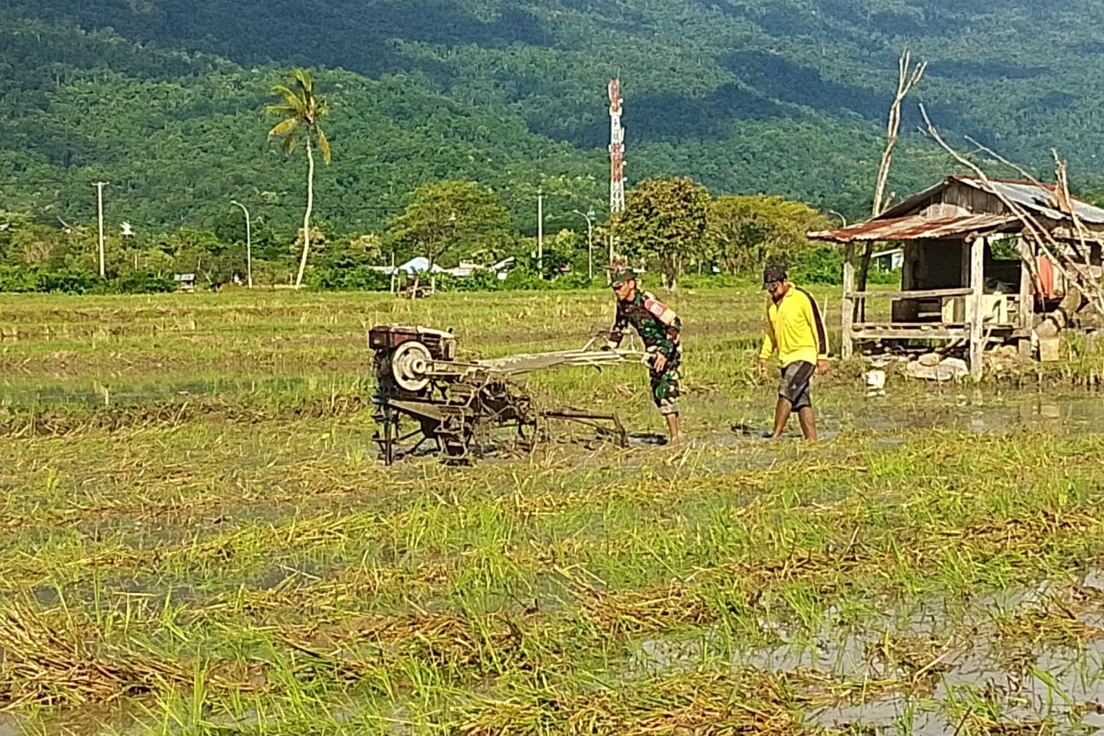 Bombana – Babinsa Koramil 1431-01/Rumbia, Serda Pajar, melaksanakan pendampingan pengolahan lahan sawah Guna meningkatkan Area Luas Tambah Tanam (LTT) sebagai bagian dari kegiatan ketahanan pangan di Kelurahan Kampung Baru, Kecamatan Rumbia Tengah, Kabupaten Bombana, Sabtu (03/05). Kegiatan ini dilakukan di lahan milik Bapak Hasman (40), guna meningkatkan produktivitas pertanian dan mendukung ketahanan pangan nasional.