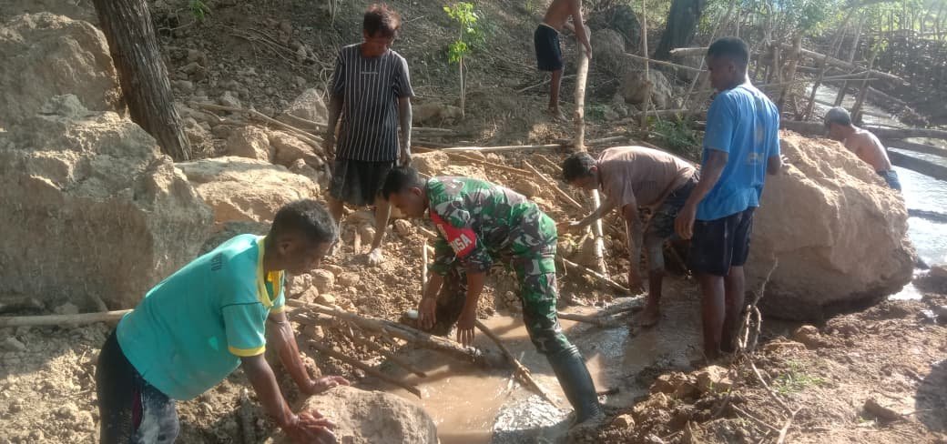 TTS _ Dalam rangka menjaga kelancaran irigasi dan mendukung produktivitas pertanian, Babinsa Koramil 02/Abanteng Jajaran Kodim 1621 TTS bersama masyarakat setempat melakukan kerja bakti membersihkan saluran air di area persawahan di Desa Nunfutu , Kec. Fatukopa Kab. Timor tengah selatan