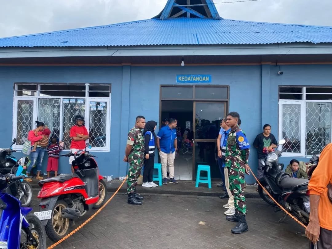 Flotim – Babinsa Koramil 1624-01/Larantuka Serka Marito Januario dan Praka Marwan Burhan berikan pengamanan dalam kedatangan KM. Lambelu di Pelabuhan Pelni Larantuka, Kabupaten Flotim. Rabu (12/02/2025).