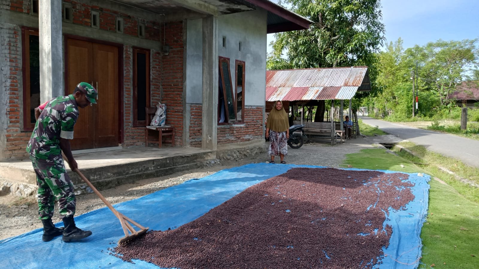 ACEH JAYA — Babinsa Koramil Jaya, Kodim 0114/Aceh Jaya, Kopka Irman, melaksanakan kegiatan pendampingan kepada warga binaannya dengan membantu Ibu Siti menjemur kopi di Desa Cot Dulang, Kecamatan Jaya, Kabupaten Aceh Jaya.