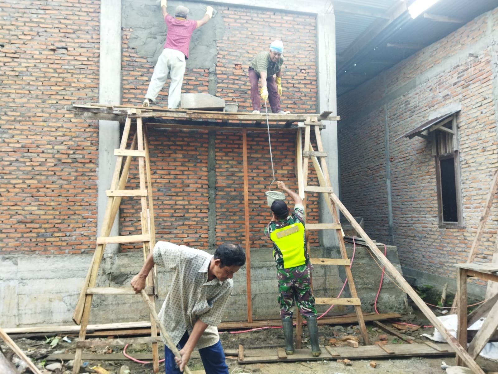 Serka Abdul Talib terjun langsung membantu proses pemasangan dinding rumah, menunjukkan kepeduliannya terhadap kondisi tempat tinggal warga. Kehadirannya memberikan semangat baru bagi warga yang sedang bergotong royong membangun rumah.
