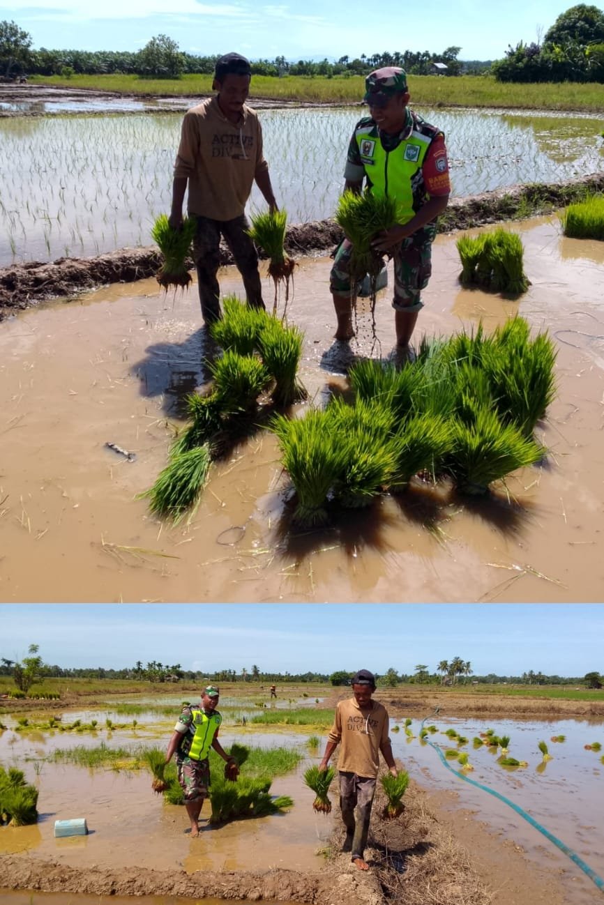 ACEH BARAT – Babinsa Koramil 0105-10/Woyla Barat Kodim 0105/Aceh Barat, Sertu Sutrisno, membantu warga binaannya membawa bibit padi yang telah dicabut untuk segera ditanam di lahan persawahan, sebagai bentuk dukungan terhadap ketahanan pangan dan kemanunggalan TNI dengan rakyat.