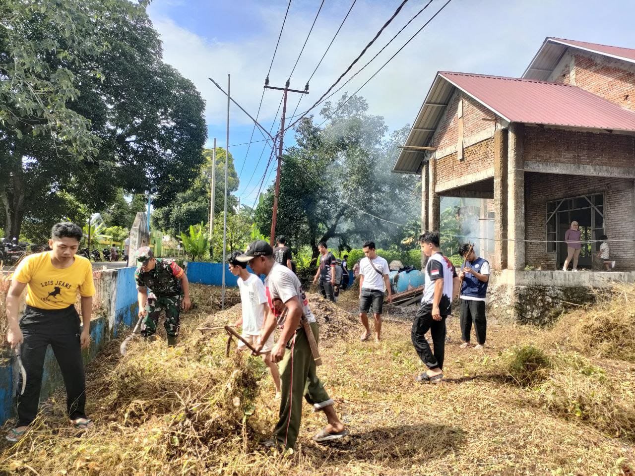 Kegiatan gotong royong ini melibatkan seluruh perangkat desa dan Babinsa yang bersama-sama membersihkan rumput liar, menyapu halaman, serta merapikan lingkungan sekitar kantor desa.