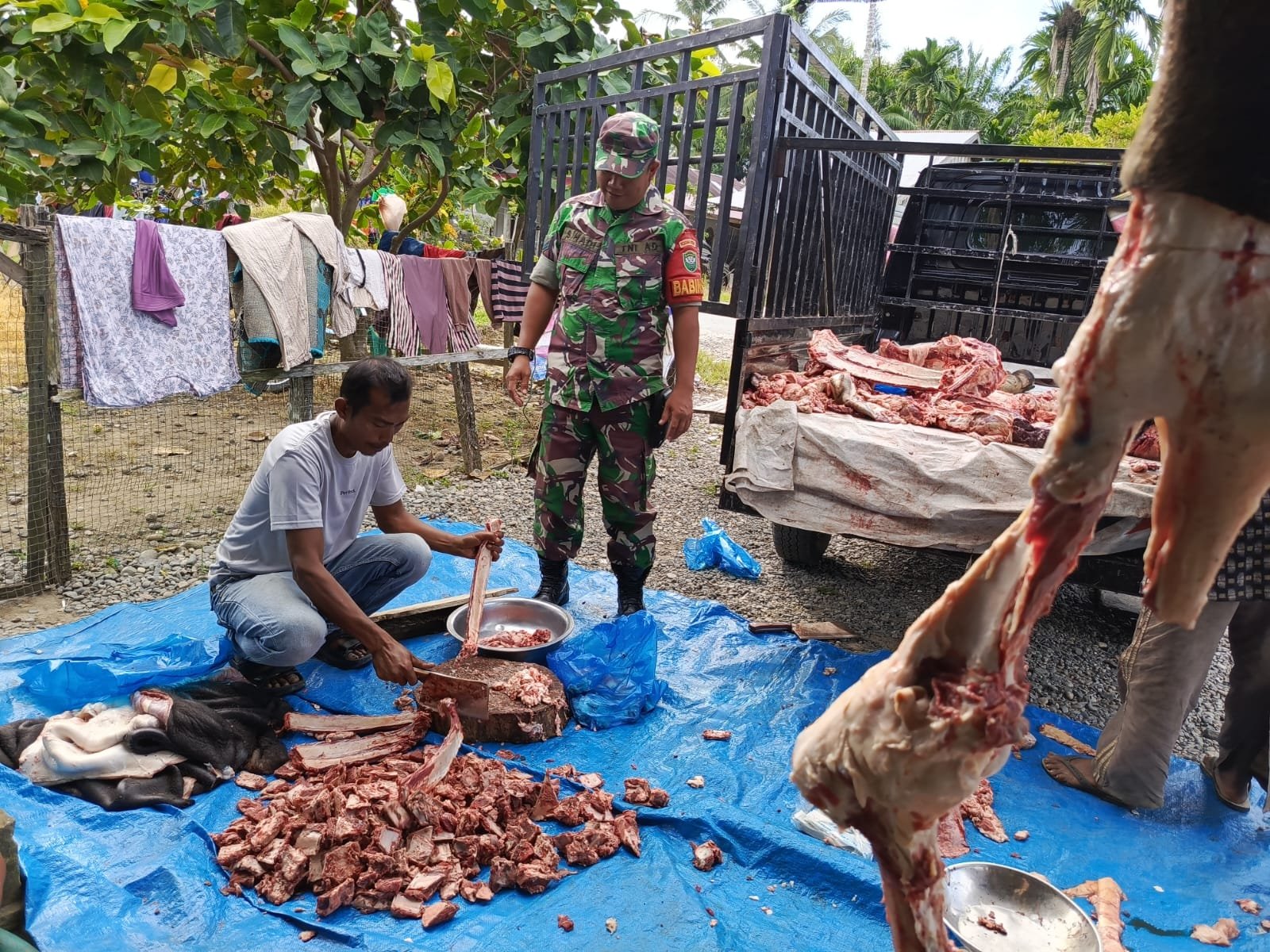 ACEH JAYA – Babinsa Posramil Pasie Raya, Kodim 0114/Aceh Jaya, Sertu Syamsul Hadi, melaksanakan kegiatan Komunikasi Sosial (Komsos) bersama salah satu pedagang daging, Bapak Erwin (39), di Desa Pasi Teubee, Kecamatan Pasie Raya, Kabupaten Aceh Jaya, Senin (22/09/25).
