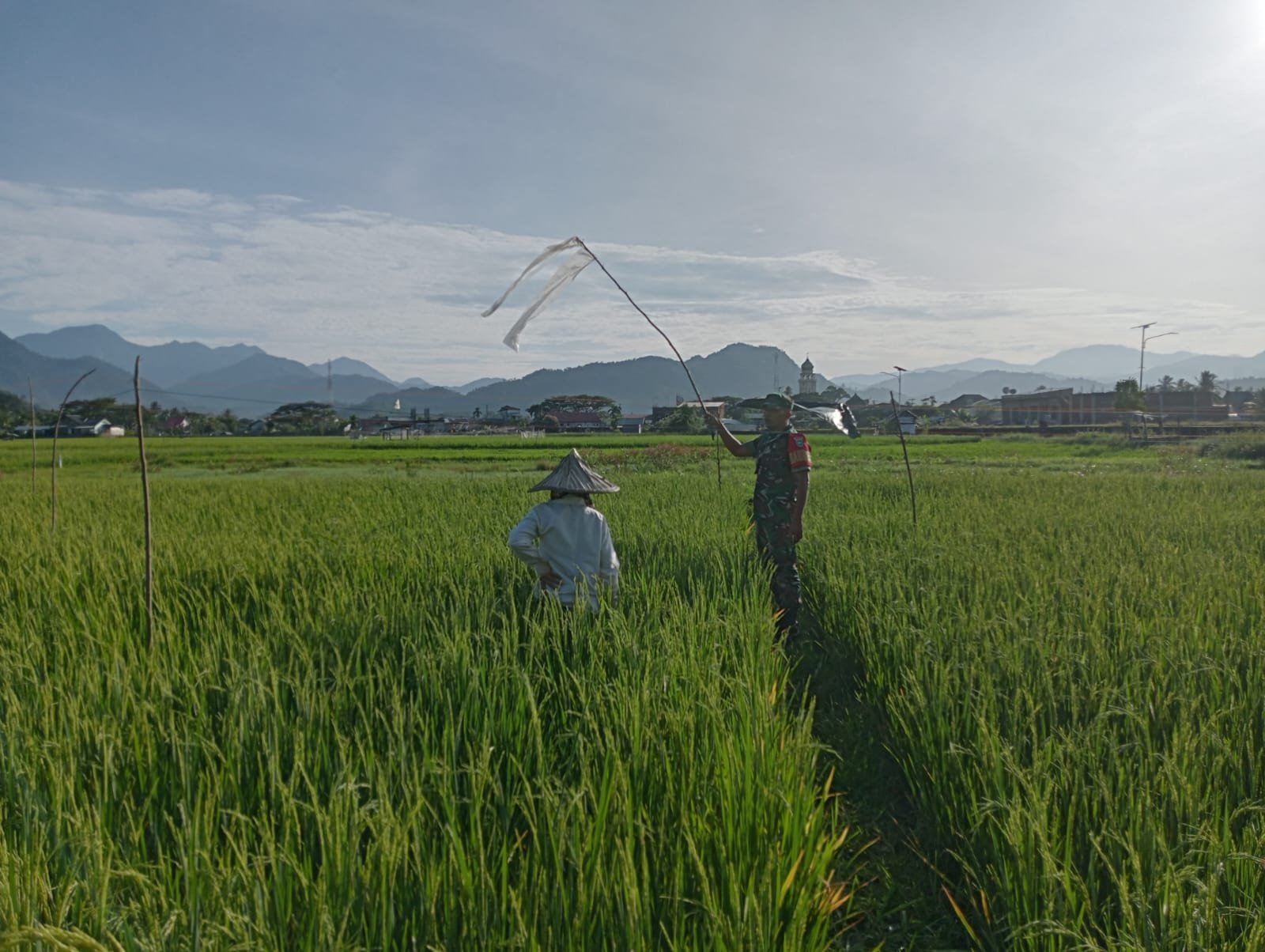Dalam kesempatan itu, Sertu Yulizar membantu petani dengan peralatan seadanya mengusir burung pemakan bulir padi tersebut.