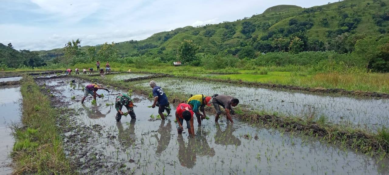 NTT – Sumba Timur. Dalam upaya mendukung program ketahanan pangan nasional, Sertu Ejiman dari Babinsa Koramil 04/Tabundung Kodim 1601/Sumba Timur melakukan pendampingan kepada petani yang sedang melaksanakan penanaman padi sawah tadah hujan di Desa Persiapan Taralodu, Kecamatan Tabundung, Kabupaten Sumba Timur, pada hari Sabtu (07/02/2026).