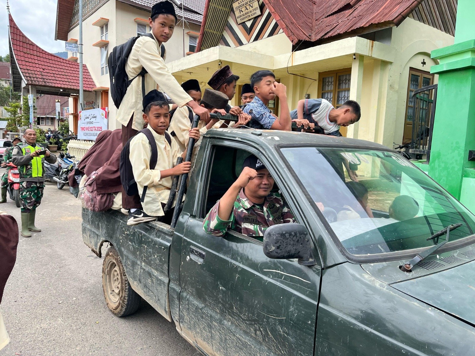 Agam – Bahagianya anak-anak SD Negeri Kecil Kampung Jorong Hilalang terpancar saat menaiki mobil patroli TNI untuk berangkat ke sekolah.