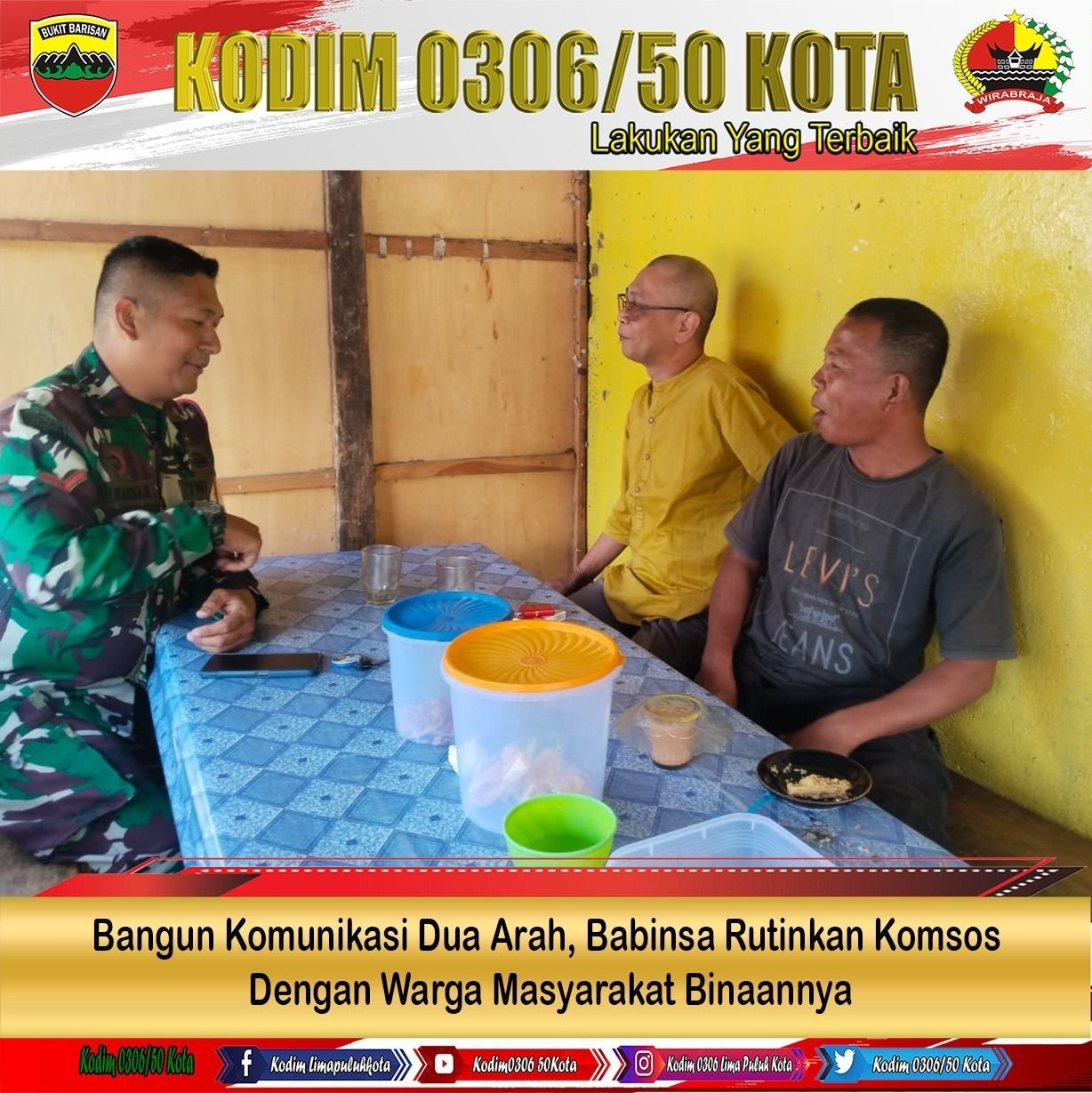 Lima Puluh Kota — Dalam rangka menunjang tugas pokok sebagai aparat kewilayahan, Kopda Zulkarnaen Babinsa dari Koramil 03 Suliki Kodim 0306/50 Kota merutinkan Komsos, bangun komunikasi dua arah dengan warga masyarakat binaannya, bertempat di Jorong Simpang Limo Nagari Andiang Kecamatan Suliki. Minggu (27/4/2025).