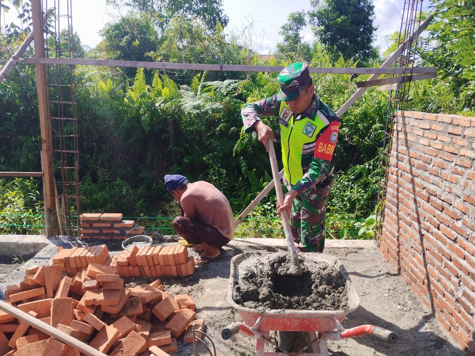 ACEH BARAT – Babinsa Koramil 03 Kaway XVI Kodim 0105 Abar, Sertu Ariyanto, menunjukkan kepedulian dan semangat gotong-royong dengan membantu warga membangun rumah di Desa Pucok Pungki, Kecamatan Kaway XVI, Kabupaten Aceh Barat, Senin (21/07/2025).