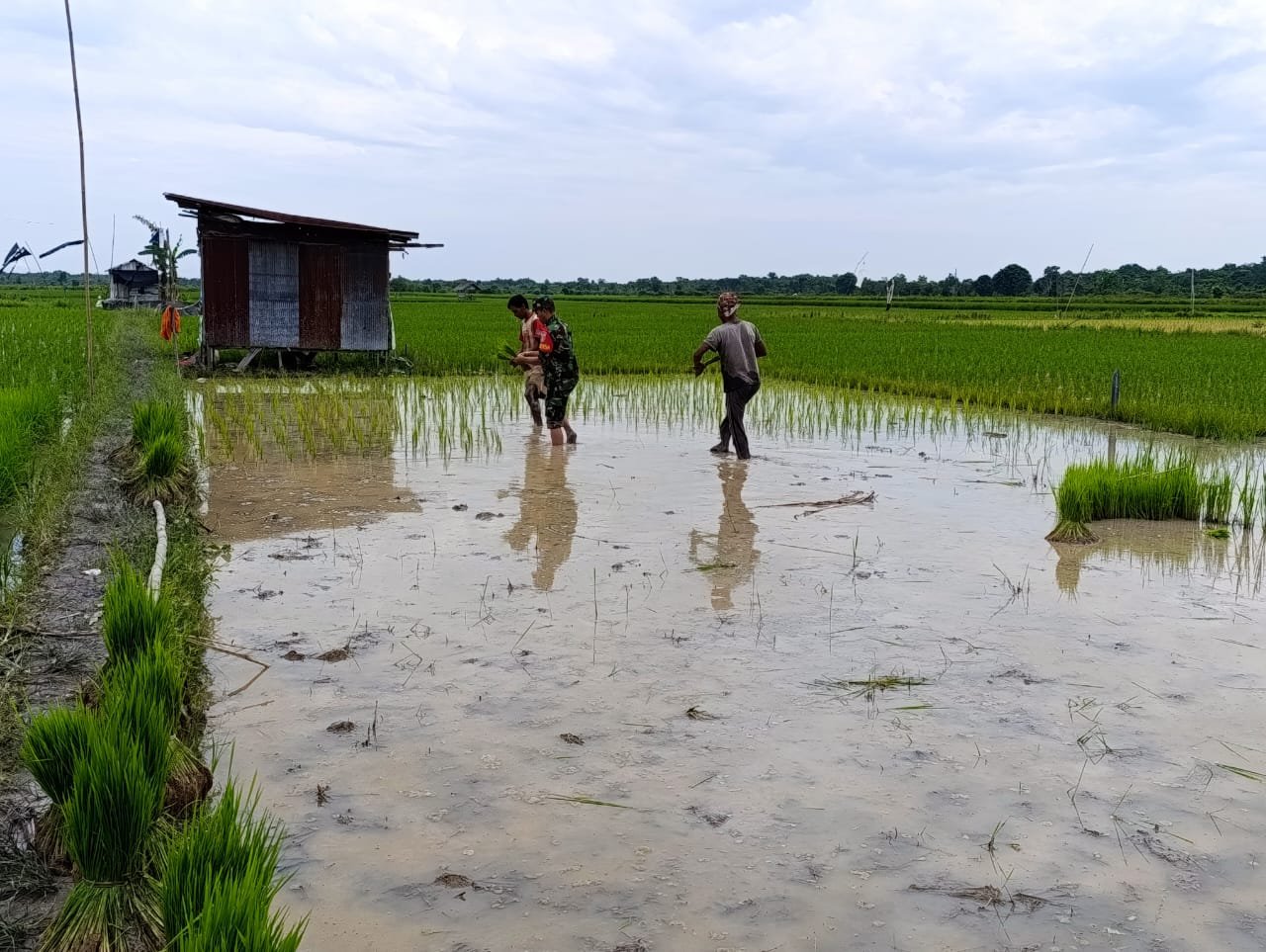 Dikatakan Sertu Yuliansyah, Kami dengan penuh semangat terjun langsung ke sawah membantu para petani di desa binaan untuk menanam padi.