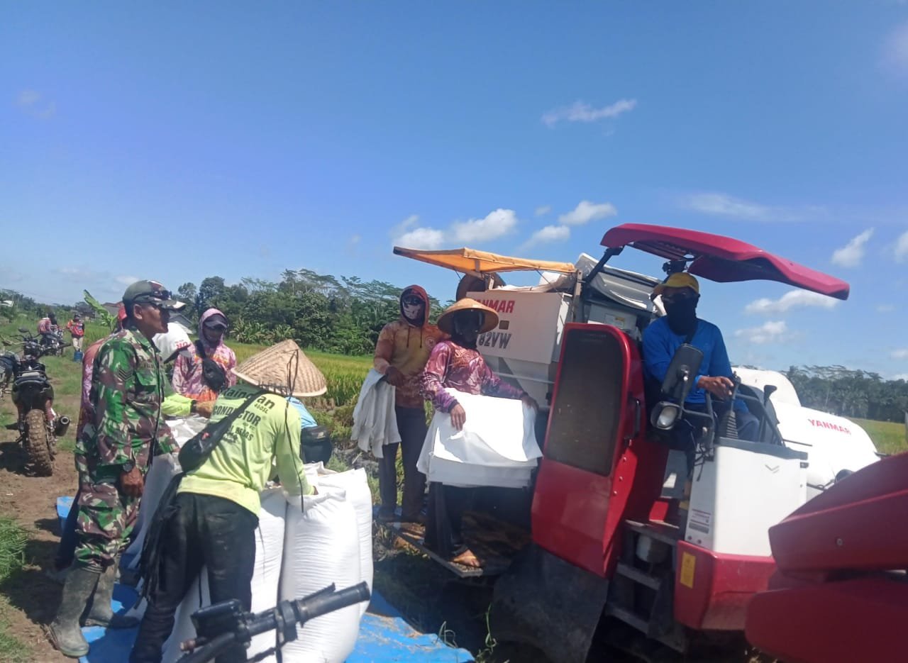 Rawajitu Selatan (Tulang Bawang) — Bentuk dukungan Babinsa sebagai aparat teritorial dalam meningkatkan ketahan pangan di wilayah binaannya, Babinsa Koramil 426-03 Rawajitu, Kodim 0426 Tulang Bawang, Serka Lilik ikut serta terjun langsung ke sawah bantu para petani memanen padi di sawah milik Bapak Mulyadi, yang berada di Kampung Bumi Ratu, Kecamatan Rawajitu Selatan, Kabupaten Tulang Bawang, Sabtu 19 April 2025.