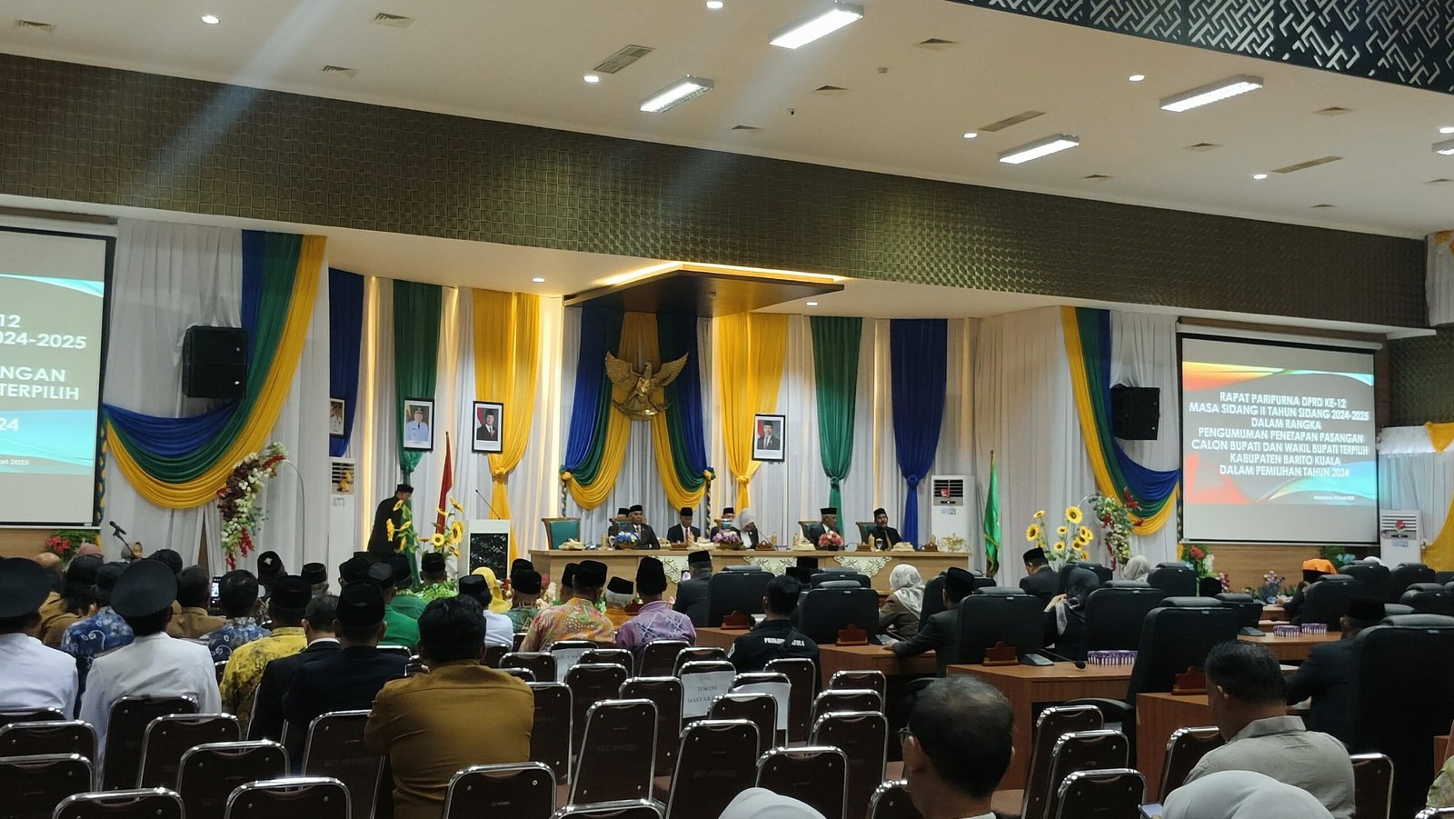 BARITO KUALA – Dandim 1005/Batola Letkol Inf Andika Suseno, S.I.P. berserta istri menghadiri kegiatan Rapat Paripurna DPRD ke-12 Masa Sidang II Tahun Sidang 2024-2025 dalam rangka Pengumuman Penetapan Pasangan Calon Bupati dan Wakil Bupati terpilih Kabupaten Barito Kuala, bertempat di Ruang Sidang Paripurna DPRD Lantai III Jl. KTM, Kel. Ulu Benteng, Kec. Marabahan, Selasa, (14/01).