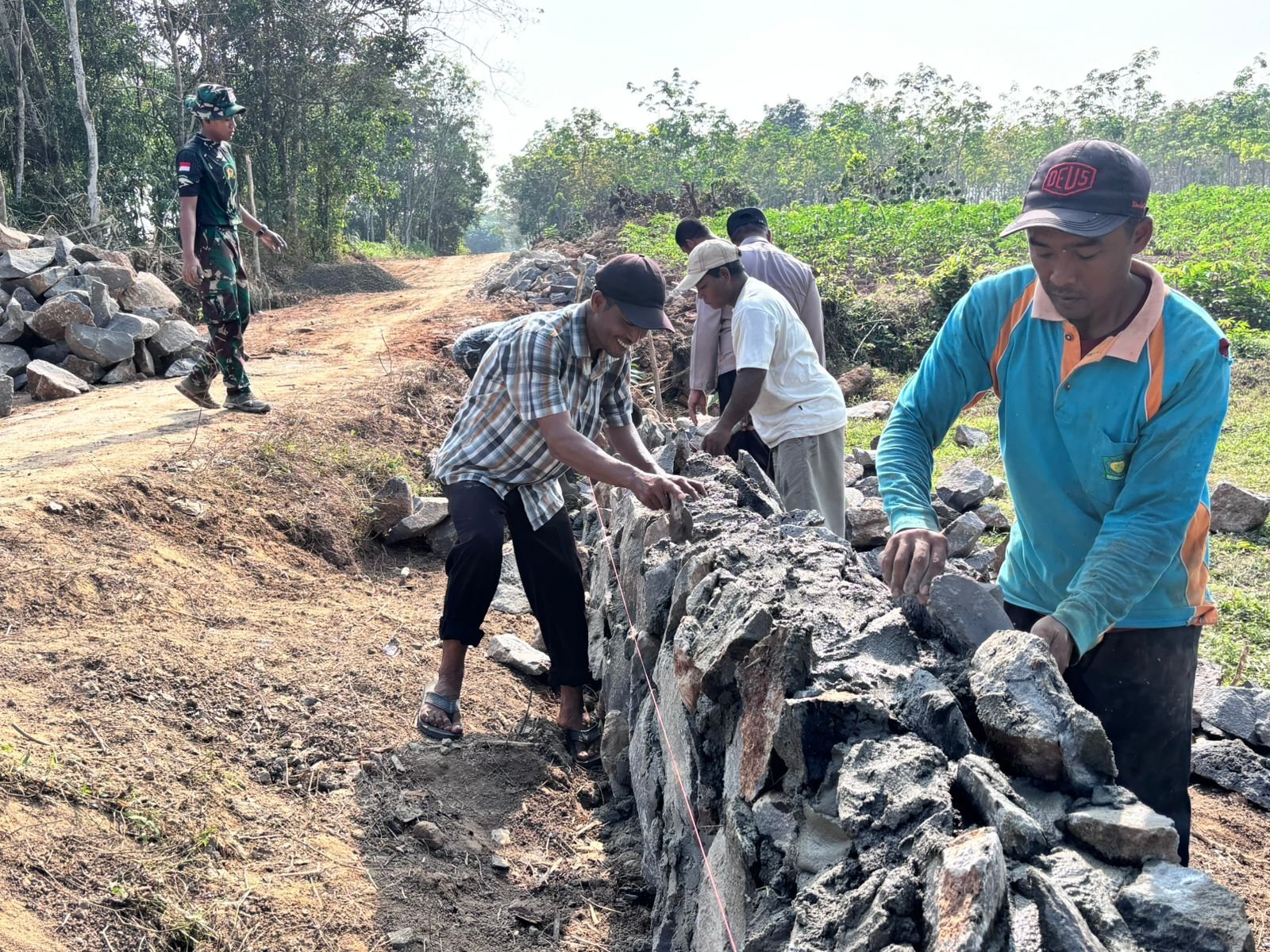 Rabu (30/07/2025), para Satgas TMMD dan warga tampak sibuk menyusun batu satu per satu. Batu-batu tersebut direkatkan dengan adukan semen dan pasir, membentuk struktur tanggul yang kokoh dan menyatu secara perlahan. Pekerjaan dilakukan dengan teliti untuk memastikan kekuatan dan kestabilan konstruksi.