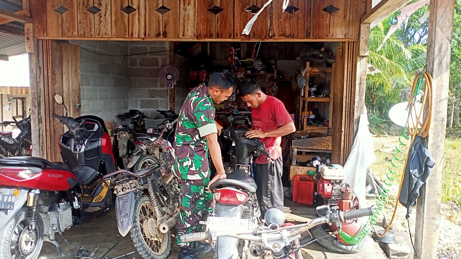 Aceh Jaya – Sebagai bentuk dukungan berupa support terhadap adanya usaha/peluang usaha di wilayah binaan, Koramil 0114-03/Setia Bakti Serda Zainal Aripin Komsos dengan bapak Maliki yang merupakan pemilik bengkel motor, di Desa Gampong Baro, Kec. Setia Bakti, Kab. Aceh Jaya, Rabu (15/01/2025).