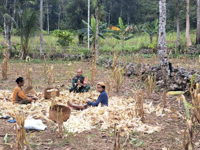 SUMBA BARAT – Dalam rangka mempererat hubungan dengan masyarakat di wilayah binaannya, Babinsa Koramil 01/Loli Kodim 1613/Sumba Barat, Serda Martin Jaga Limu, melaksanakan komunikasi sosial (komsos) dengan warga yang sedang melaksanakan panen jagung di kebun, tepatnya di Desa Karekanduku Utara, Kecamatan Tanarighu, Kabupaten Sumba Barat, Jumat (25/7/2025).