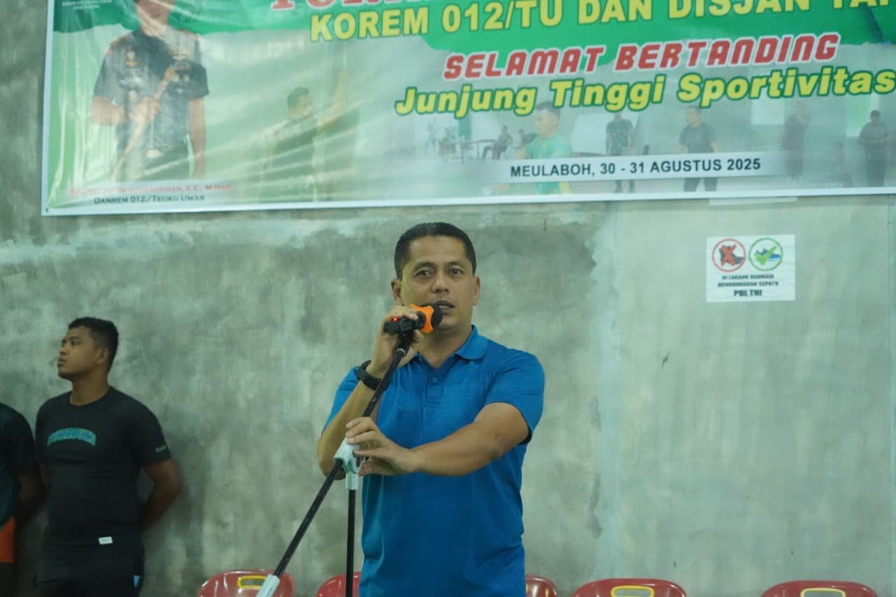 Meulaboh – Komandan Korem (Danrem) 012/Teuku Umar Kolonel Inf Benny Rahadian, S.E., M.Han., secara resmi membuka turnamen bulutangkis Korem 012/Teuku Umar dan Disjan TA 2025 di Gedung Olahraga (GOR) Korem 012/TU, Sabtu (30/08/2025). Kegiatan ini diikuti oleh seluruh personel yang berdinas di Makorem 012/TU dan satuan Balak Disjan jajaran.