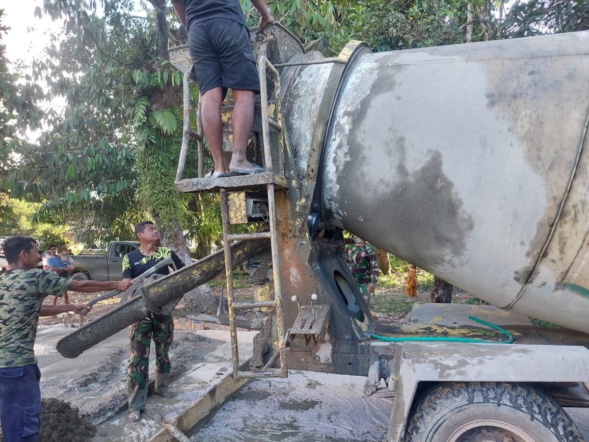 Pekerjaan pengecoran yang dilaksanakan secara gotong royong antara personel Satgas TMMD dan warga Desa Batu Kotam, Kecamatan Bulik, Kabupaten Lamandau, berjalan dengan lancar dan sesuai target waktu.