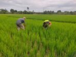 ACEH BARAT – Babinsa Koramil 03 Kaway XVI Kodim 0105/ Abar Serka Saferi Pasaribu membantu warga merawat tanaman padi dengan membersihkan rumput