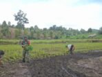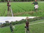 ACEH BARAT — Dalam semangat pengabdian dan kebersamaan, Anggota Koramil 09/Samatiga, Sertu Buchari Muslim, turun langsung ke sawah bersama Pak Adi, salah