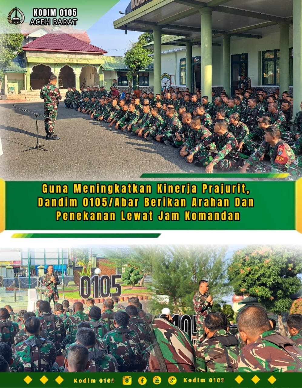ACEH BARAT – Guna meminimalisir pelanggaran dan meningkatkan kinerja prajurit, Dandim 0105/Abar Letkol Inf S. Kembaren, S.E., M.I.P., CFrA., memberikan penekanan dan arahan kepada seluruh anggota melalui Jam Komandan di halaman Makodim setempat, Jalan Imam Bonjol, Desa Drien Rampak, Kecamatan Johan Pahlawan, Senin (19/01/2026).