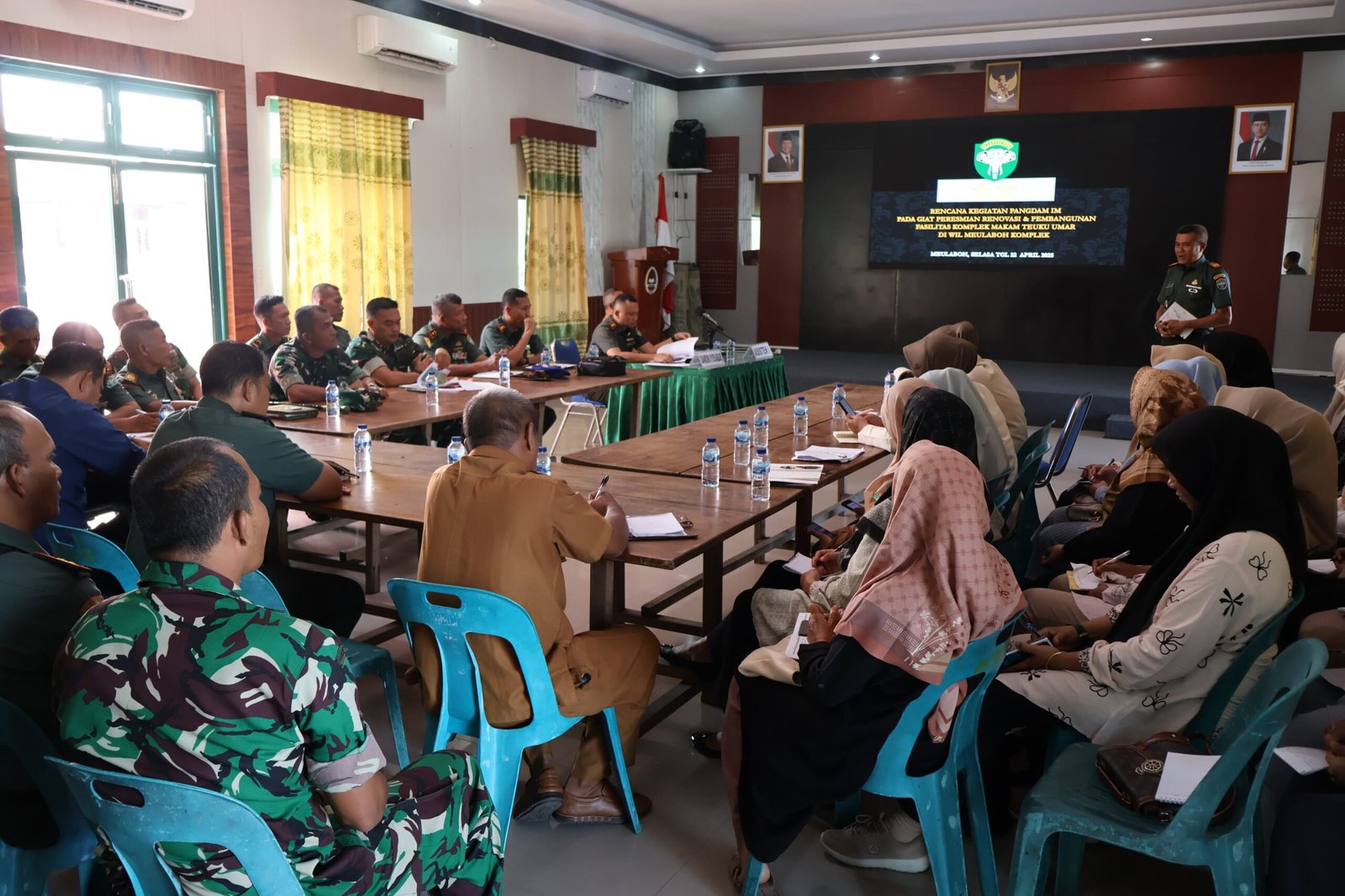 Dalam apersepsinya, Dandim menjelaskan bahwa inti materi pembahasan rapat ini adalah mematangkan kesiapan dalam menyambut kunjungan Pangdam IM dengan titik lokasi utama adalah Komplek Makam Pahlawan Nasional Teuku Umar di Desa Mugoe Rayeuk, Kecamatan Panton Reu, pada tanggal 22 April 2025 nanti.