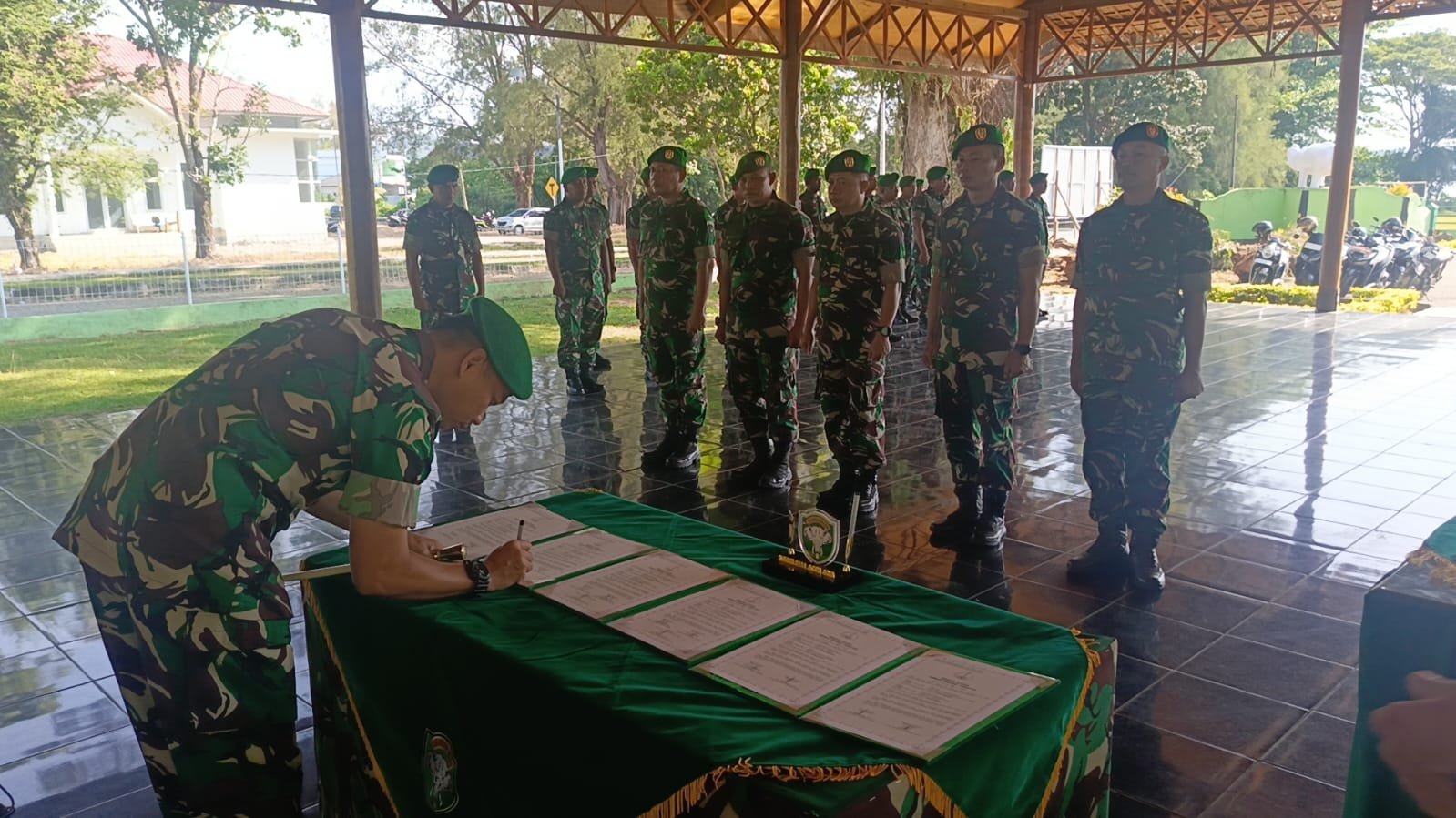 Upacara laporan korps serah terima jabatan tersebut ditandai dengan penandatanganan naskah serah terima jabatan Danramil dan Perwira Staf, yang disaksikan langsung oleh Dandim 0114/Aceh Jaya. Kegiatan berlangsung tertib, khidmat, dan penuh rasa tanggung jawab.