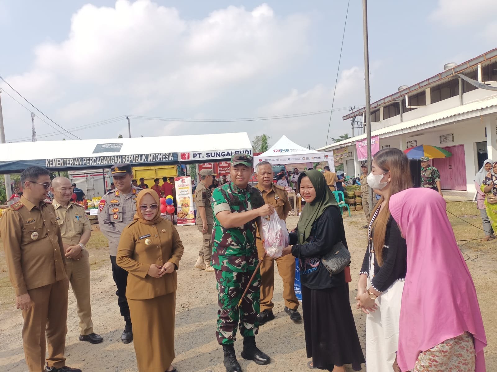 Mesuji – Komandan Kodim (Dandim) 0426/Tulang Bawang, Letkol Kav Delvy Marico, S.E., M.IP., menghadiri kegiatan Gerakan Pasar Murah yang digelar Forkopimda Kabupaten Mesuji bersama perusahaan BUMN dan swasta di Desa Simpang Pematang, Kecamatan Simpang Pematang, Senin (11/8/2025) pagi.