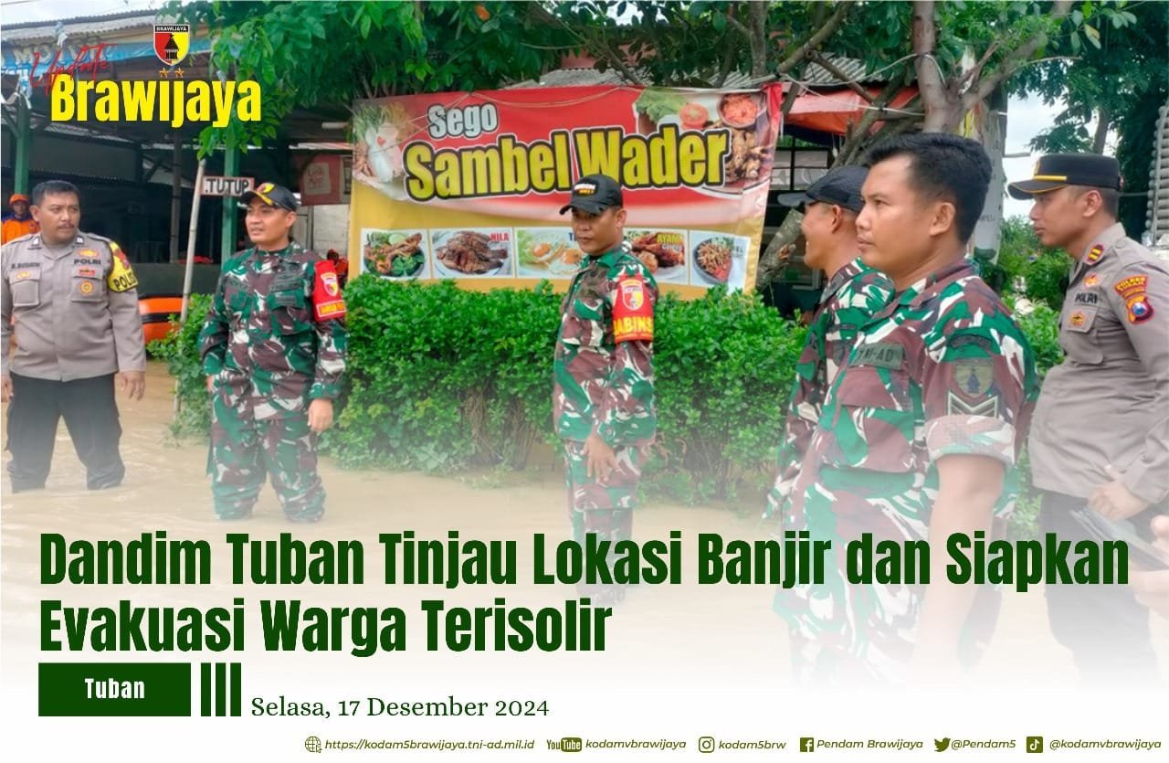 Tuban,- Dandim 0811/Tuban, Letkol Inf Dicky Purwanto, terjun langsung ke lokasi banjir di Desa Brangkal, Kecamatan Parengan. Kunjungan ini bertujuan memastikan kesiapsiagaan prajurit TNI dalam memberikan bantuan kepada warga yang terisolir akibat banjir.