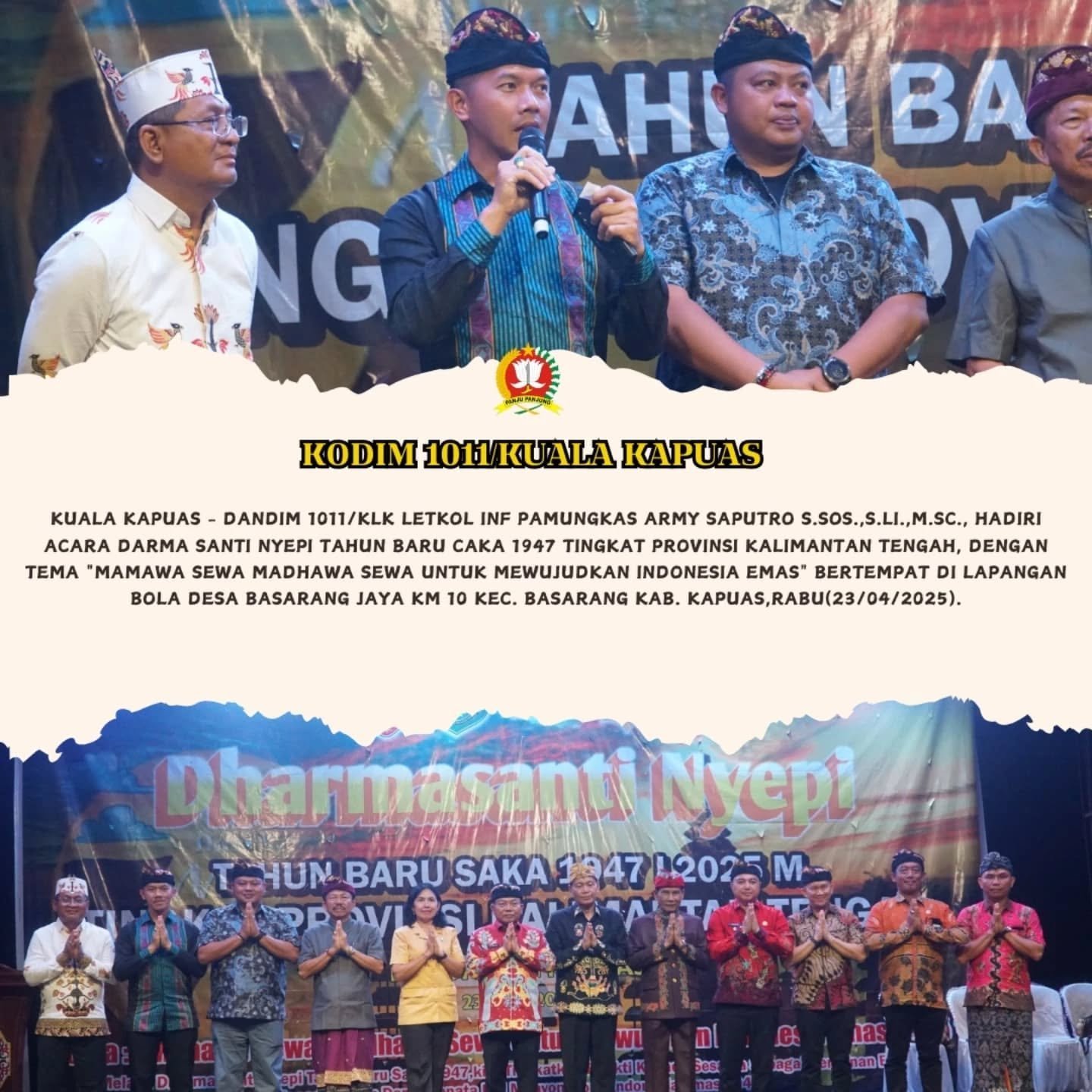 Kuala Kapuas – Dandim 1011/Klk Letkol Inf Pamungkas Army Saputro S.Sos.,S.Li.,M.Sc., Hadiri Acara Dharma Shanti Perayaan Hari Raya Suci Nyepi Tahun baru Saka 1947 Tingkat provinsi Kalimantan Tengah, Dengan Tema “Mamawa sewa madhawa sewa untuk mewujudkan Indonesia emas” bertempat di lapangan bola Desa Basarang jaya Km 10 Kec. Basarang Kab. Kapuas,Rabu(23/04/2025).