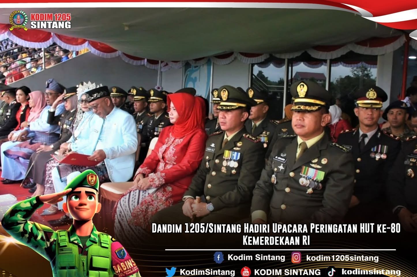 Sintang, 17 Agustus 2025 — Komandan Kodim 1205/Sintang, Letkol Inf Rangga Bayu Widiartha, menghadiri upacara peringatan Hari Ulang Tahun ke-80 Kemerdekaan Republik Indonesia yang dipusatkan di Lapangan Stadion Baning Sintang.