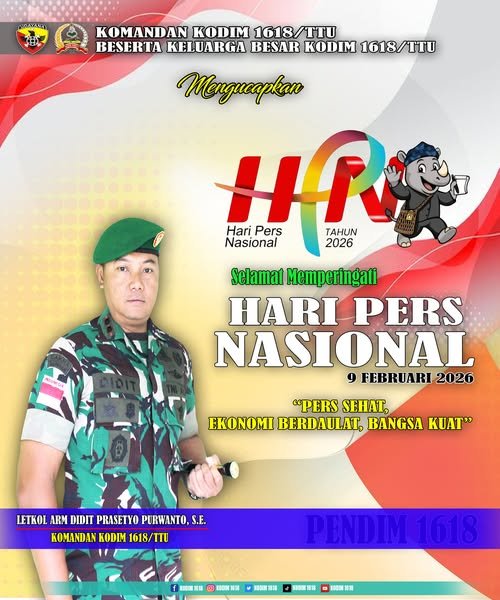 TTU – Dalam rangka peringatan Hari Pers Nasional (HPN) 2026, Komandan Kodim 1618/Timor Tengah Utara (TTU), Letkol Arm Didit Prasetyo Purwanto, S.E., mengucapkan selamat dan memberikan apresiasi kepada seluruh insan pers yang berkontribusi dalam menyampaikan informasi kepada publik. Letkol Arm Didit menekankan bahwa pers memiliki peran penting sebagai pilar demokrasi dan mitra strategis dalam mendukung pembangunan nasional, termasuk dalam penyebarluasan program-program pemerintah dan TNI kepada masyarakat luas.