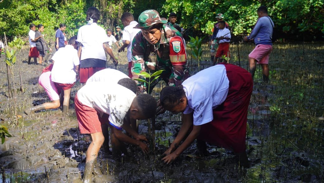 Nabire, 5 Agustus 2025 — Semangat pelestarian lingkungan dan edukasi sejak dini terlihat nyata dalam kegiatan penanaman pohon mangrove yang berlangsung di Kampung Makimi, Distrik Makimi, Kabupaten Nabire, Provinsi Papua Tengah. Kegiatan ini merupakan bagian dari sasaran tambahan program TNI Manunggal Membangun Desa (TMMD) ke-125 Tahun 2025 yang digelar oleh Kodim 1705/Nabire.