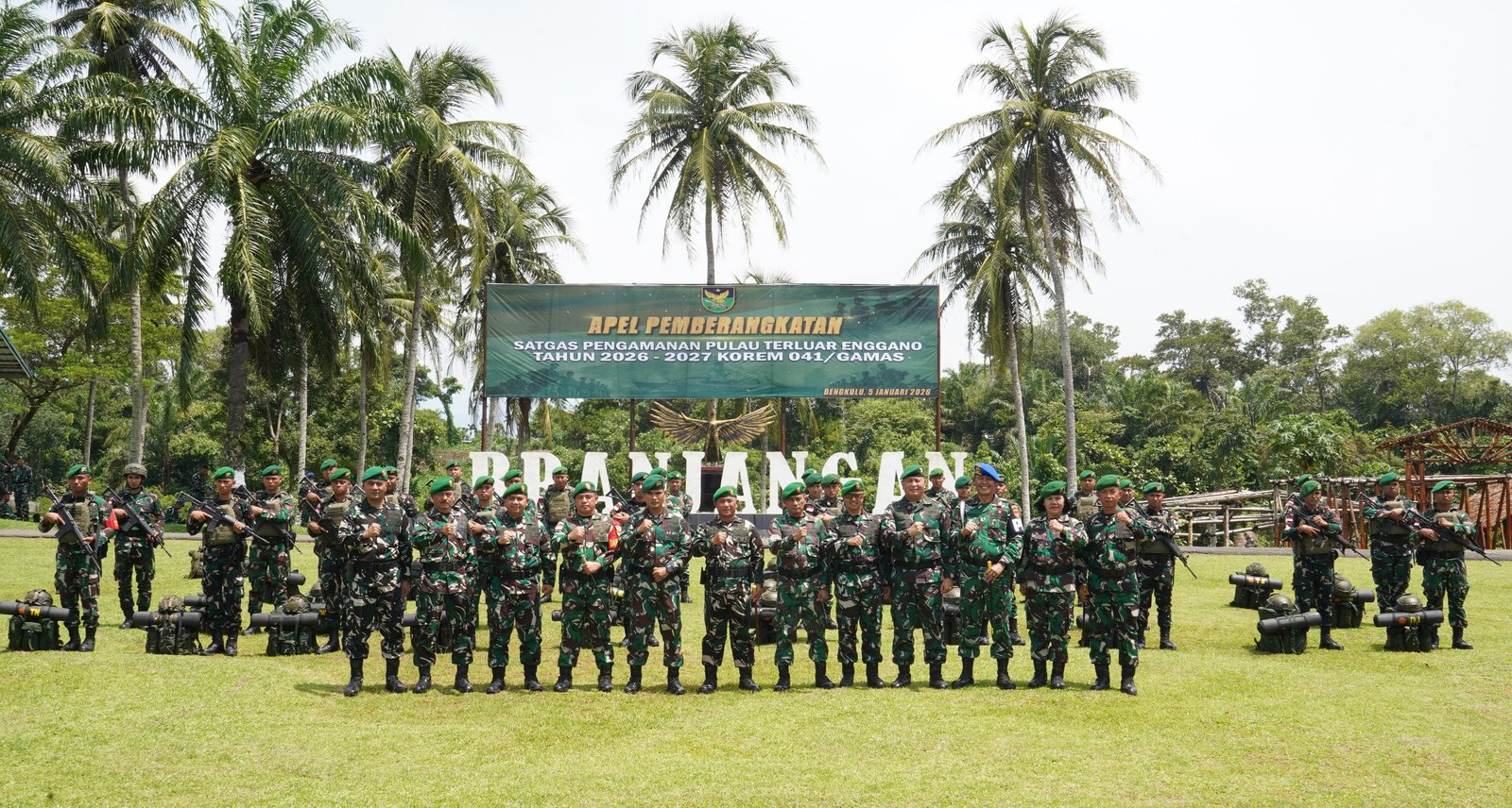 Bengkulu – Pada hari Senin, 5 Januari 2026, Danrem 041/Gamas Brigjen TNI Jatmiko Aryanto, S.E., M.Han. memimpin upacara resmi pemberangkatan Satuan Tugas (Satgas) Pengamanan Pulau Terluar Enggano. Upacara ini berlangsung di Markas Korem 041/Gamas dan menjadi titik awal bagi 33 personel terpilih dari Batalyon Infanteri 144/Jaya Yuda untuk menjalankan tugas mulia menjaga kedaulatan Negara Kesatuan Republik Indonesia (NKRI).