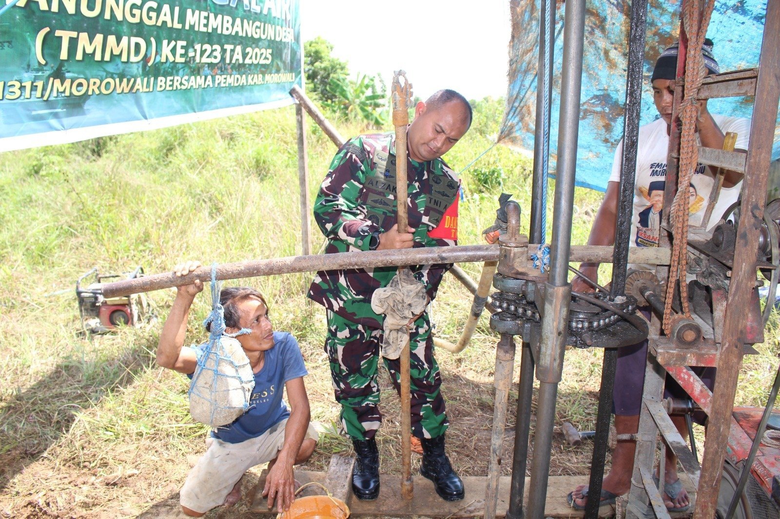 Morowali – Di tengah terpaan terik matahari, Komandan Satuan Tugas (Dansatgas) TMMD Kodim 1311/Morowali, Letkol Inf Alzaki terjun langsung ke lokasi salah satu sasaran fisik utama pembangunan sumur bor, bak air dan Mandi Cuci Kakus (MCK) yang kini sedang dibangun di lima titik di tiga Desa yakni desa Bahomahoni tiga titik, Desa Bahoruru satu titik dan Desa Kajukoo satu titik, Kabupaten Morowali, Senin (24/2/2025).