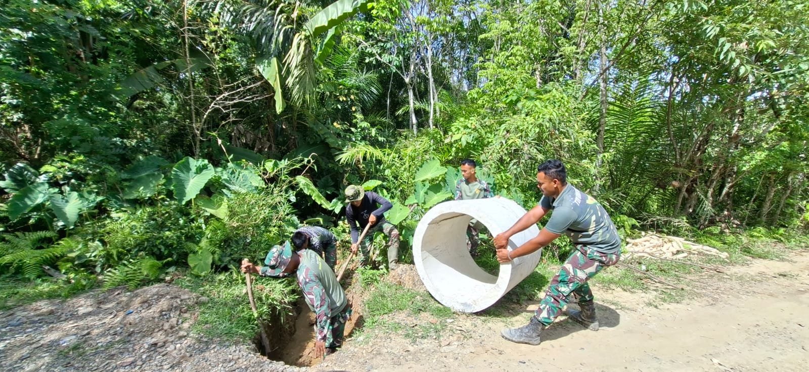 Dengan penuh kekompakan, personel dari Kodim 0105/Aceh Barat dan masyarakat menurunkan material cincin beton, menyusunnya dengan presisi, lalu menimbun dan merapikan badan jalan.