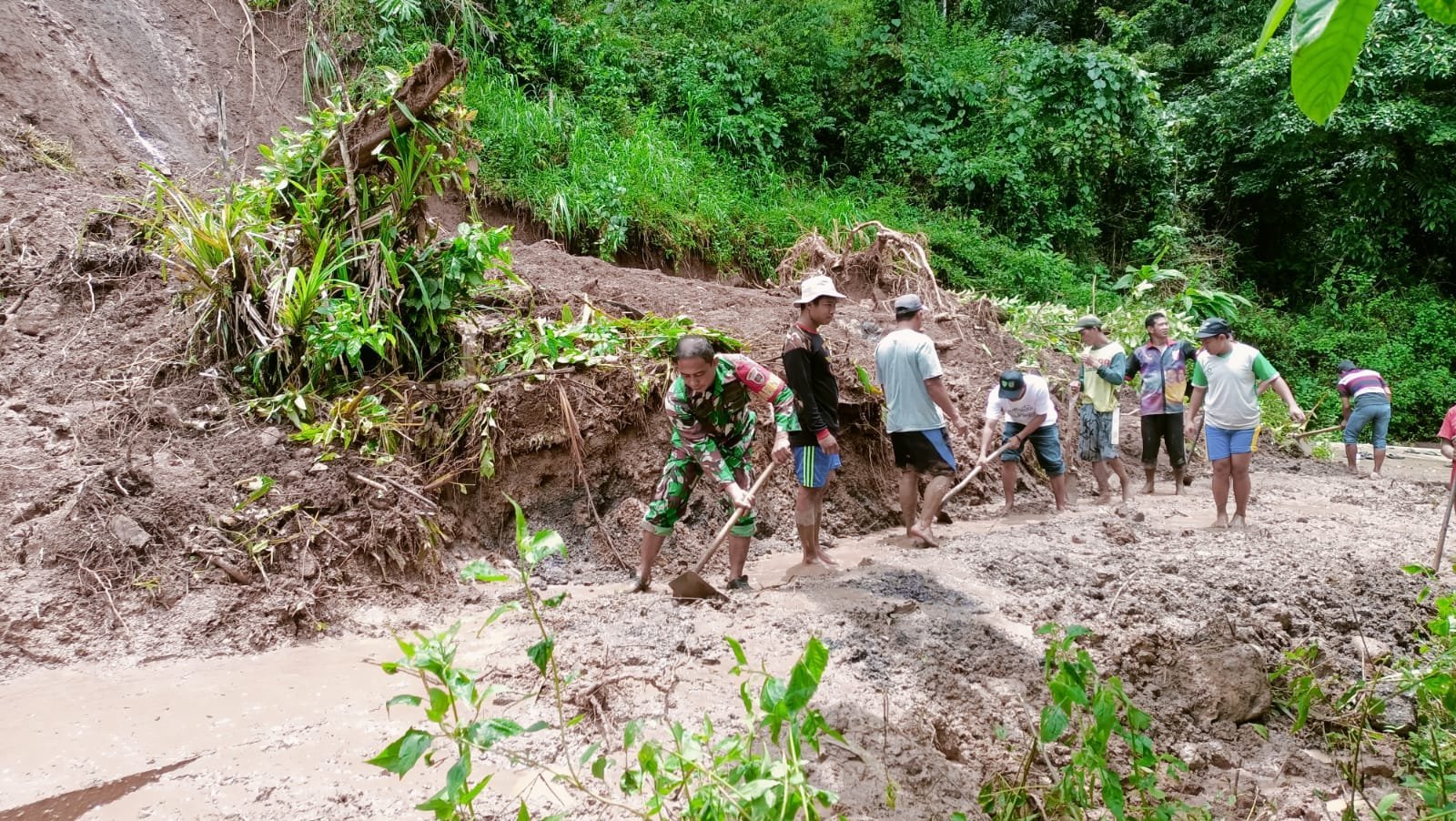Dengan menggunakan alat seadanya, seperti cangkul, sekop, dan parang, Babinsa bersama warga bahu-membahu menyingkirkan tanah dan bebatuan yang menutupi jalan akibat longsor yang terjadi setelah hujan deras mengguyur wilayah tersebut. Meski peralatan terbatas, semangat gotong royong dan kebersamaan tetap menjadi kekuatan utama dalam upaya pemulihan akses jalan.