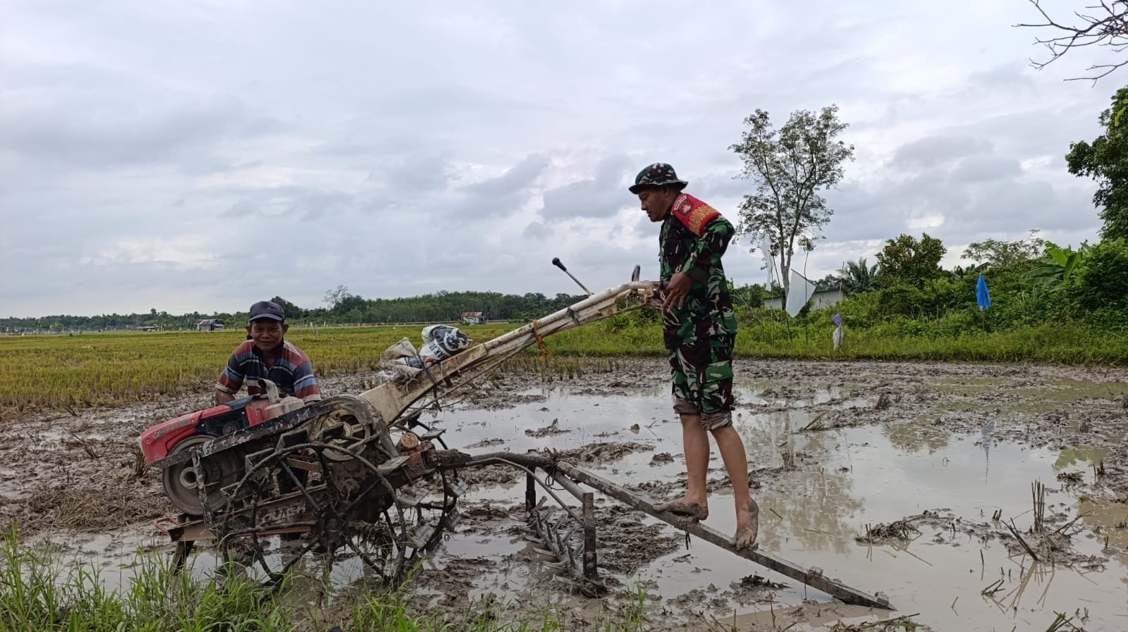 TAPIN – Di tengah hamparan sawah yang basah dan berlumpur, tampak seorang prajurit TNI berdiri di atas alat pembajak tanah sambil mengarahkan traktor tangan. Kakinya tenggelam di lumpur, namun semangatnya tetap tegak. Pemandangan itu memperlihatkan kedekatan TNI dengan rakyat, khususnya para petani di pedesaan.