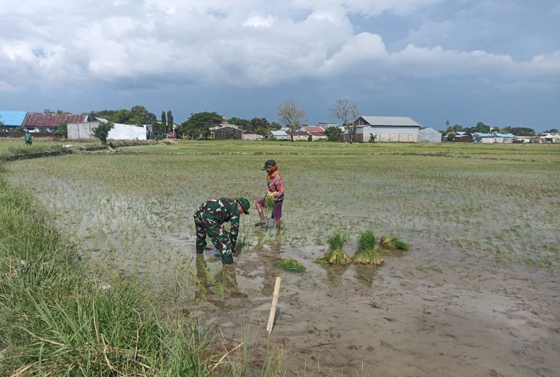TAKALAR – Dukung Ketahanan Pangan, Babinsa Koramil 1426-03/Galut, Kodim 1426/Takalar, bantu Petani tanam padi. Seperti yang dilakukan oleh Babinsa Desa Aeng Batu-batu Serka Agus Haryanto melakukan pendampingan dengan membantu dalam menanam padi, bertempat di Desa Aeng Batu-batu, Kecamatan Galesong Utara, Kabupaten Takalar. Senin (19/05/2025).