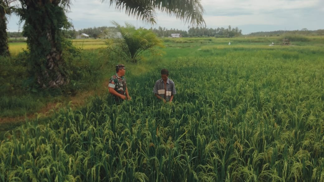 Aceh Jaya – Babinsa Koramil 0114-06/Teunom Koptu Sugianto bersama bapak Muhammad Nur mengecek tanaman padi miliknya yang berada di Desa Paya Baro Kecamatan Teunom, Kabupaten Aceh Jaya, Kamis (27/02/2025).