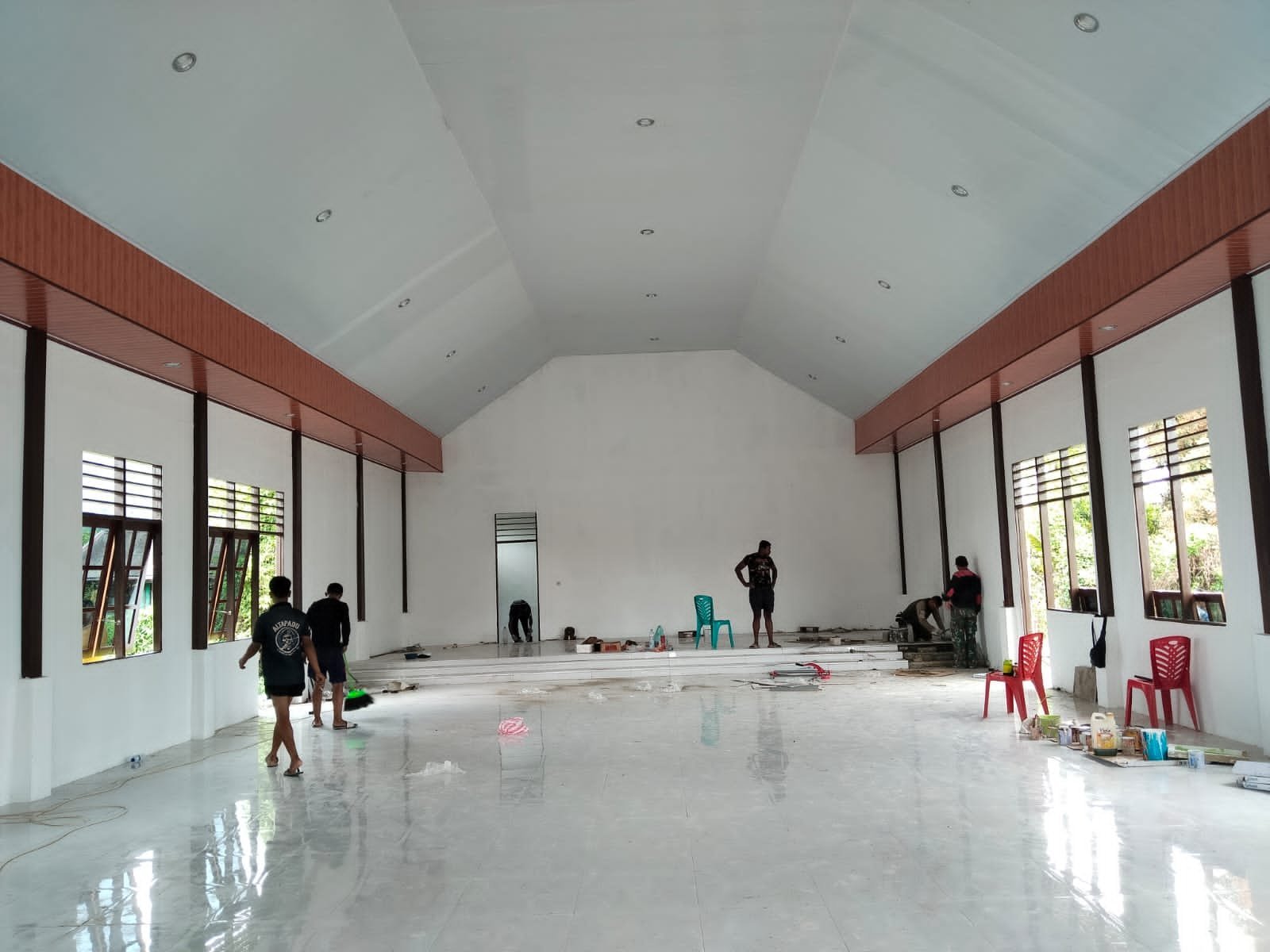 Semangat gotong royong sangat terasa. Warga bersama personel TNI saling membantu, bahkan beberapa jemaat sudah mulai membawa kursi dan perlengkapan ibadah untuk persiapan peresmian.