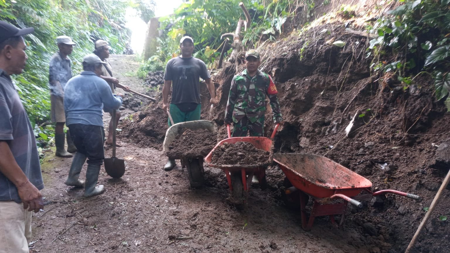 Tabanan – Babinsa Desa Jegu, Koramil 1619-08/Penebel, Serka I Made Duduk, bersama warga masyarakat melaksanakan kegiatan kerja bakti gotong royong pembersihan longsoran tanah yang menutupi jalan menuju Pura Dalem Adat Jegu, Banjar Dinas Cepag, Desa Jegu, Kec.Penebel, Selasa (15/7/2025).