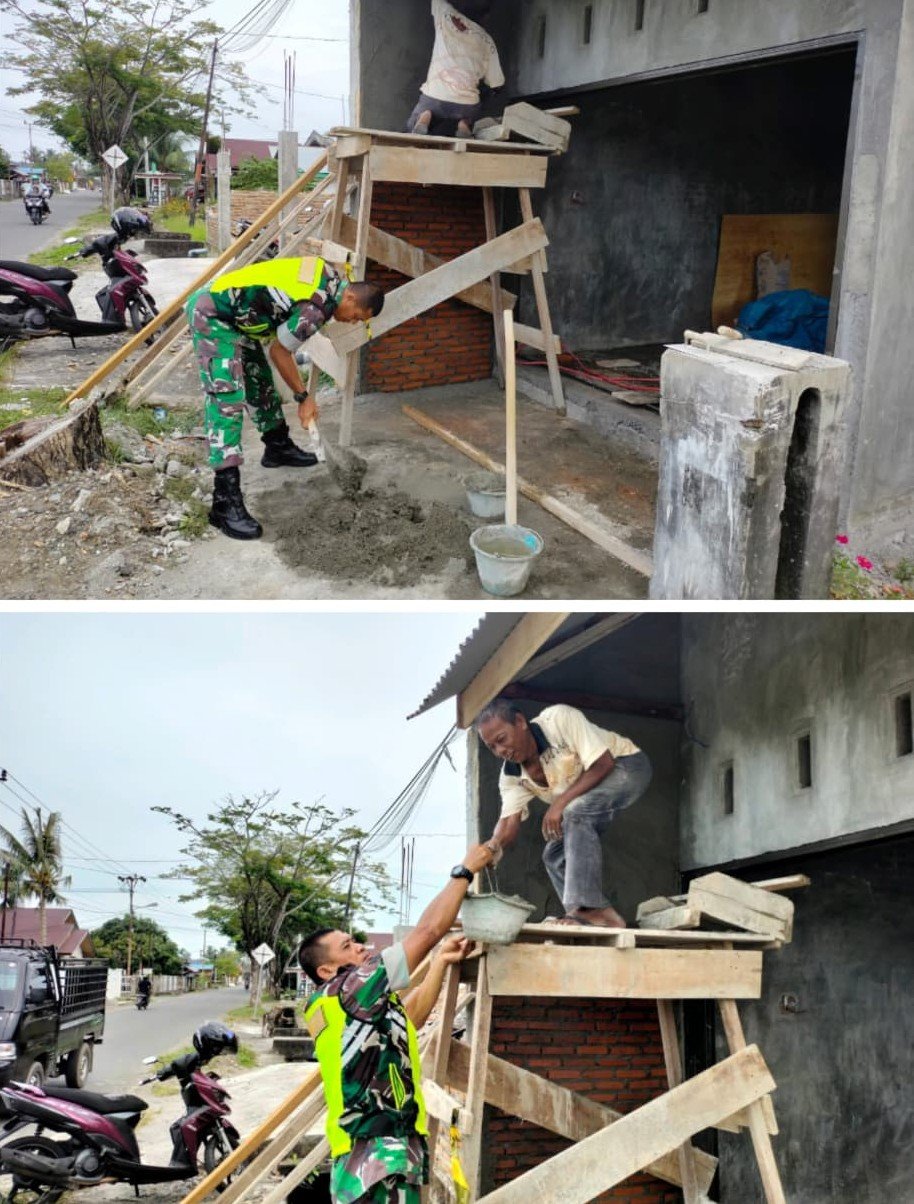 ACEH BARAT – Sertu Agustino, Babinsa Koramil 07/Johan Pahlawan, Kodim 0105/Aceh Barat, turut membantu warga membangun rumah di Desa Gampa, Kecamatan Johan Pahlawan, Kabupaten Aceh Barat, Minggu (19/04/2026).