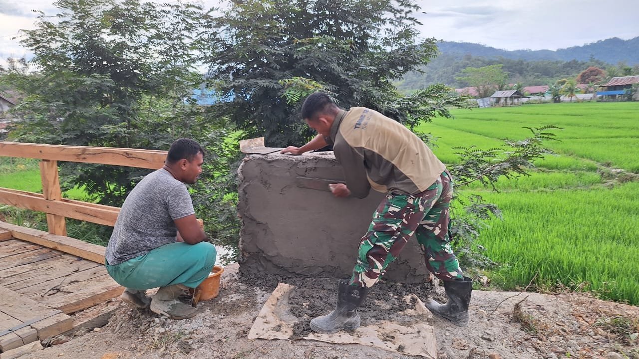 Perbaikan dimulai dengan membersihkan bagian kuping jembatan yang rusak, kemudian dilakukan proses plaster oleh anggota Satgas yang sudah terbiasa menggunakan peralatan bangunan. Warga pun turut serta membantu, mulai dari menyiapkan material hingga meratakan adukan.