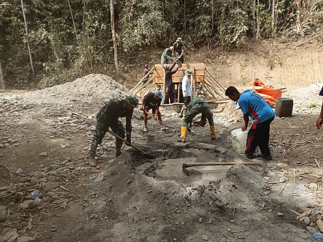 Proses pengecoran dilakukan dengan melibatkan puluhan warga yang tampak antusias membantu personel TNI. Mereka bergantian mengaduk adonan semen, mengangkut bahan material, dan meratakan coran di lokasi pembangunan. Meskipun panas matahari terasa menyengat, semangat kerja sama antara TNI dan masyarakat tidak surut.