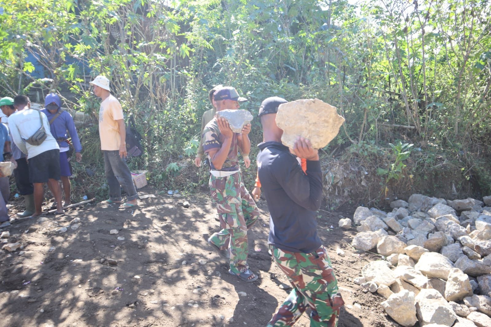 Sumbawa, NTB – 30 Juli 2025 – Di tengah suasana kerja yang penuh semangat, tampak prajurit TNI dari Satgas TMMD ke-125 dan warga Dusun Pernang saling bahu membahu membangun jembatan penghubung Kalabeso–Labuan Burung. Proyek ini menjadi bukti nyata kemanunggalan TNI dan rakyat dalam membangun desa.