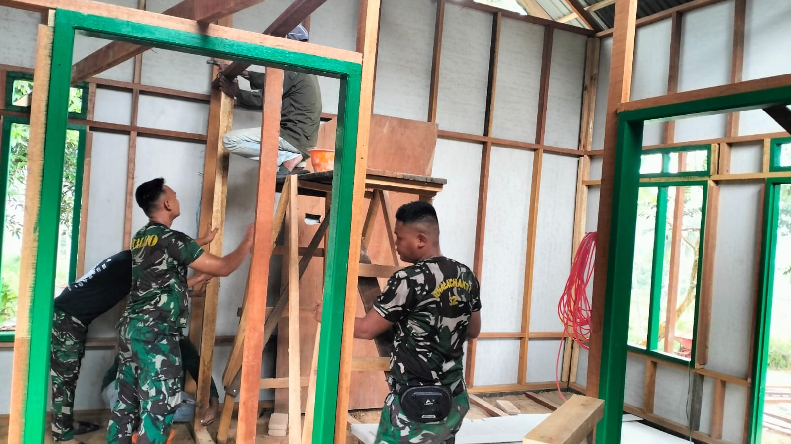 Proses pembangunan rumah Rahman juga memperlihatkan semangat gotong royong antara prajurit TNI dan masyarakat. Mulai dari menyiapkan material, mengangkat klasiboard, hingga menyesuaikan rangka bangunan dilakukan secara bahu-membahu.