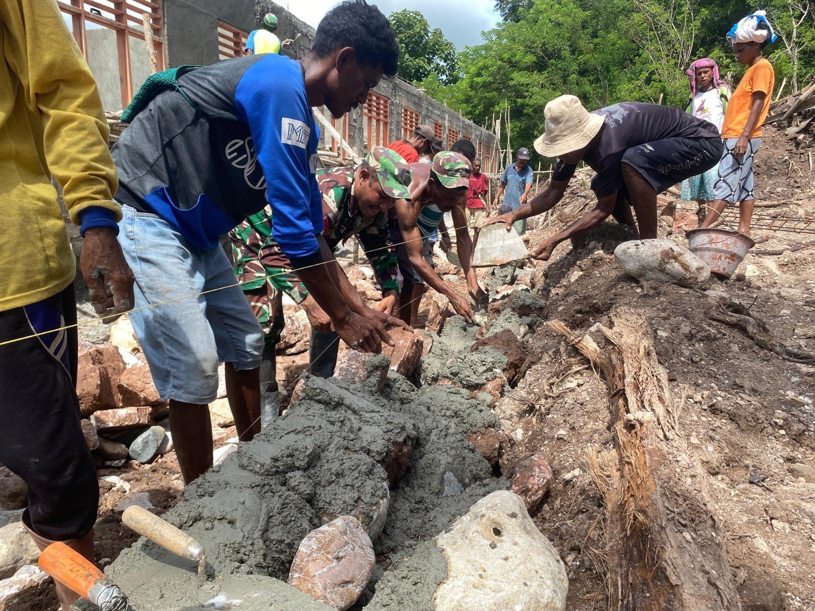 NTT-KEFAMENANU., Kamis 27 Februari 2025., Suara cangkul, sekop, dan adukan semen terdengar nyaring di belakang SDN Lanaus. Satgas TMMD Ke-123 Kodim 1618/TTU bersama warga Desa Lanaus tengah berjibaku mengecor pondasi penahan gedung sekolah baru. Dengan penuh semangat, mereka memastikan bangunan berdiri kokoh demi kenyamanan dan keselamatan anak-anak sekolah.