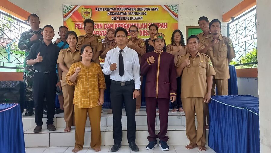 Tumbang Talaken – Babinsa Koramil 1016-04/Manuhing Sertu Amir Mahmud menghadiri pelantikan dan pengambilan sumpah jabatan perangkat desa yang lama ke perangkat desa yang baru, bertempat di Aula Kantor Desa Bereng Belawan,Kecamatan Manuhing,Kabupaten Gunung Mas,Selasa (11/02/2025).