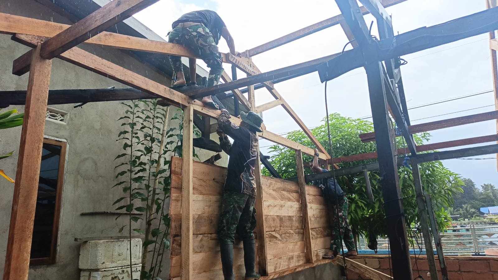 Selama proses pengerjaan, para prajurit tetap fokus pada penyusunan rangka kayu dan pemasangan dinding rumah secara bertahap. Suara alat kerja bersinergi dengan semangat gotong royong yang terus terjaga meski cuaca tidak mendukung.
