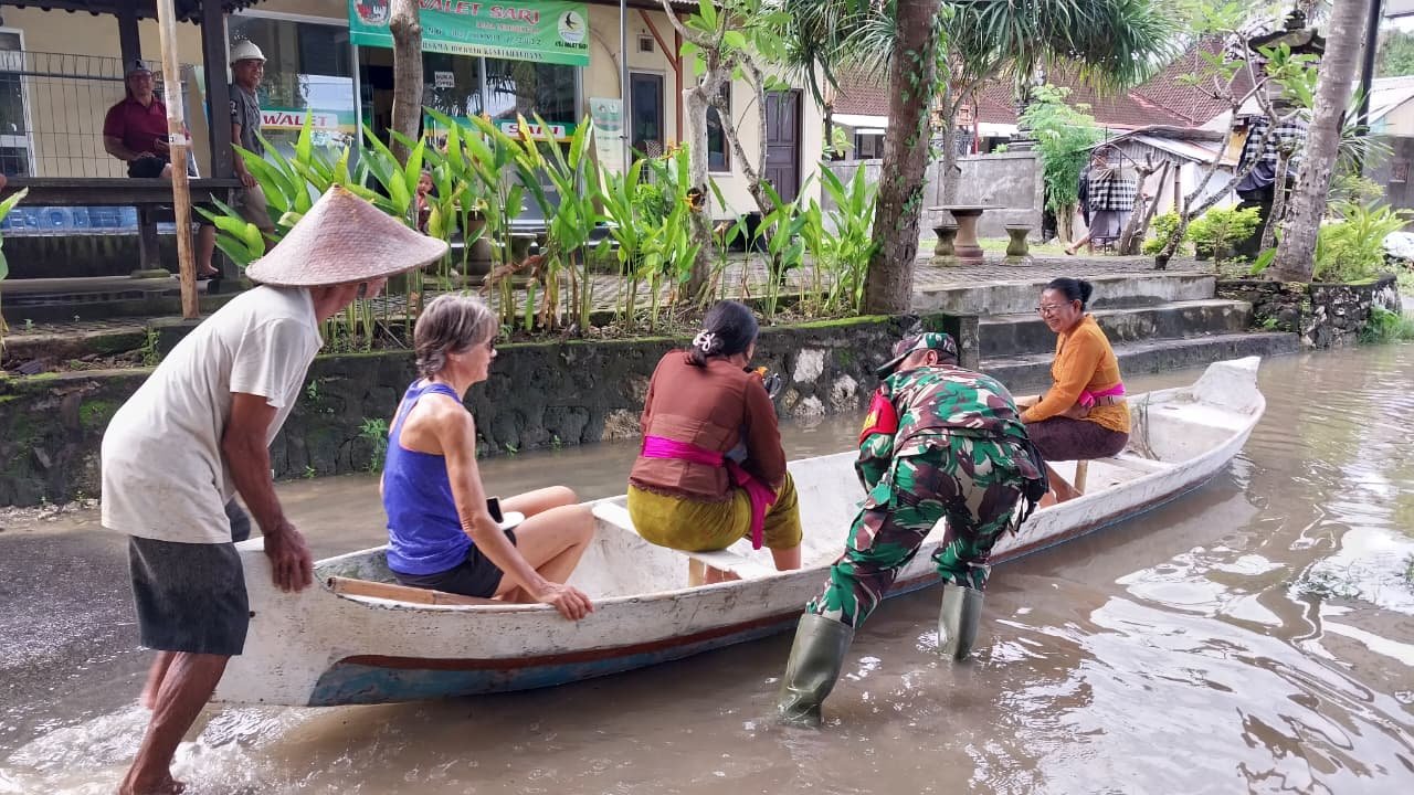 Banjir yang mengganggu akses jalan sepanjang 50 meter ini jelas berdampak pada aktivitas masyarakat dan pengunjung yang ingin menikmati keindahan alam Lembongan. Koptu Kuswara secara aktif mendorong perahu agar warga dapat beraktivitas dengan lebih lancar.